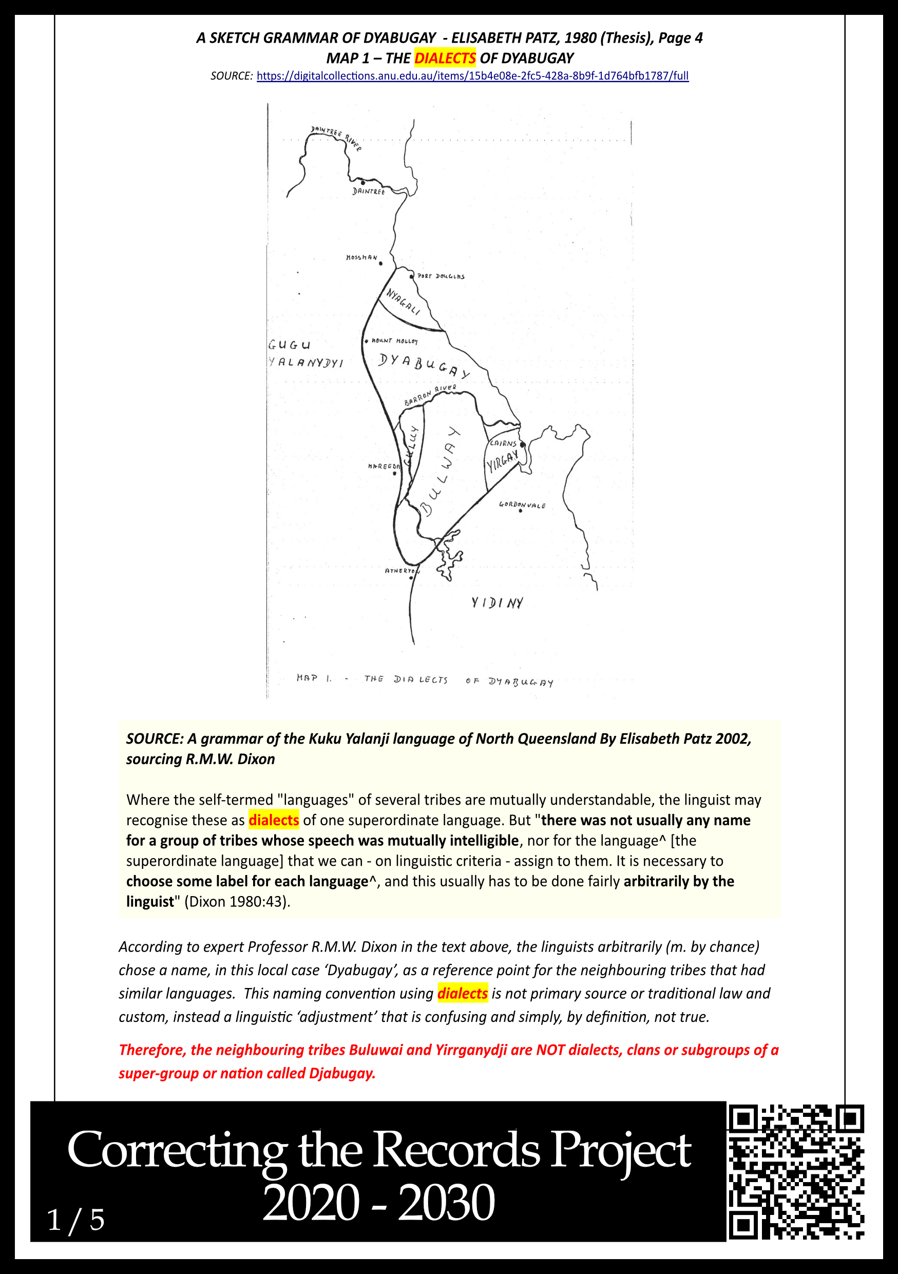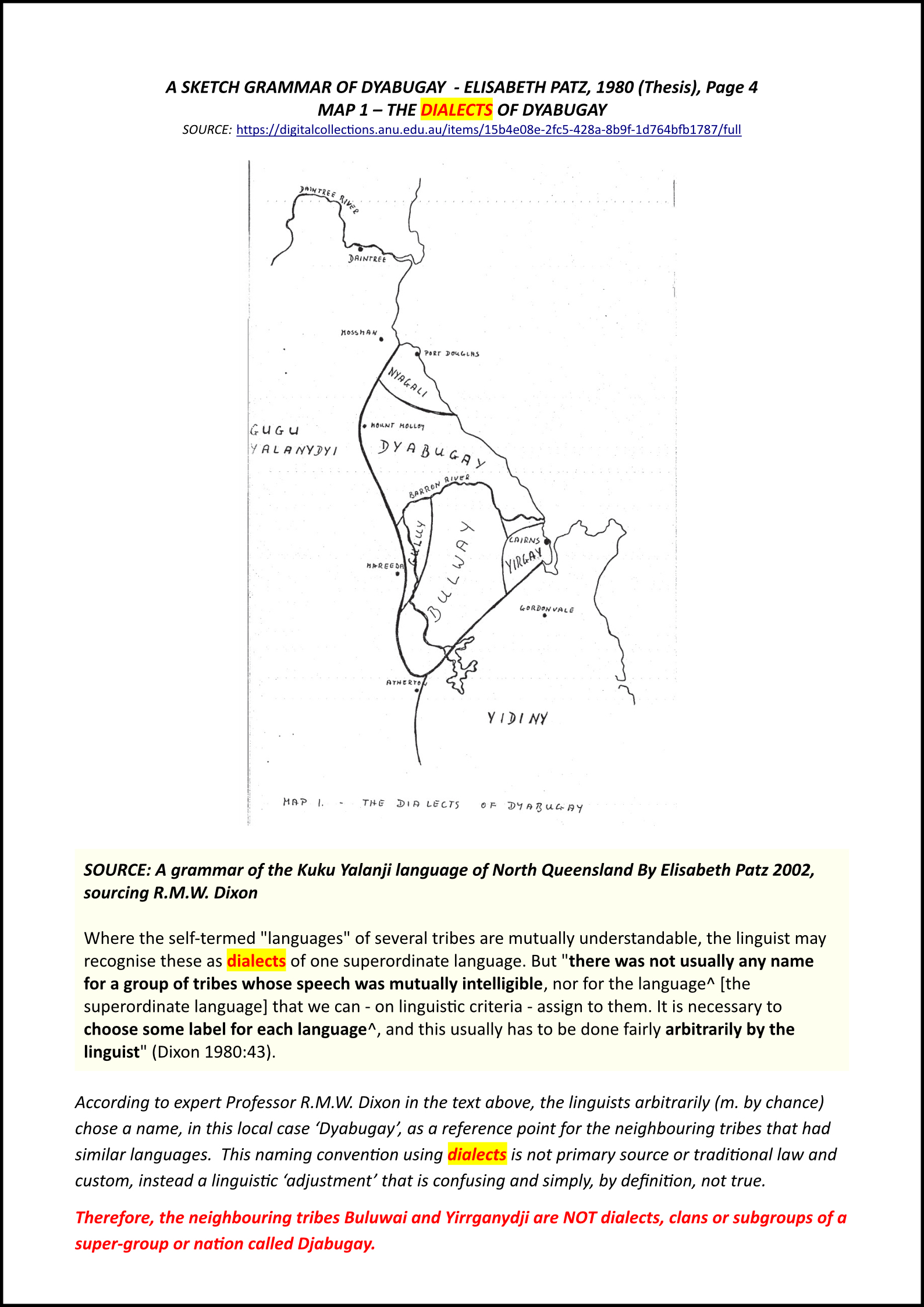 PATZ proposed in 1980 that these neighbouring tribes were dialects of Djabugay. PATZ 2002 publication she quotes DIXON to explain (see RED text below) “It is necessary…”. That is, PATZ arbitrarily chose ‘Djabugay’ however, she could have equally chosen ‘Buluwai’ or ‘Yirrgay’ to coin the term to describe language similarities between these neighbouring tribes. PATZ also describes that pre-colonisation these tribes saw themselves with their own languages and did not group themselves according to linguistic dialect theory.